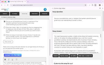 지원 프로세스를 시작하는 것 외에도, Common App Helper는 에세이에 대한 최종 검토 기능도 제공합니다. 이를 통해 사용자는 제출하기 전에 자신의 제출물을 다듬을 수 있습니다. 단순성과 사용의 용이성에 중점을 두어, 이 추가 기능은 대학 지원의 복잡성을 효과적으로 탐색하려는 학생들을 위해 맞춤 설계되었습니다.